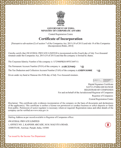 4Waydial Pvt. Ltd. is an ISO-9001- 2008 certified organization, catering to the unique individual business needs of the clients.With our innovative business model, we're also recognized as a startup initiative by the Department for Promotion of Industry and Internal Trade(DPIIT)in the year 2019.
